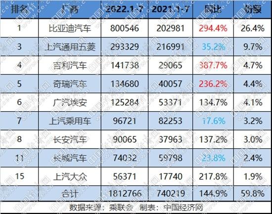 7月,新能源乘用车市场继续旺销,在销量前15车企中,传统品牌占据10席,共计销售38.41万辆,同比增长177.4%;其市场份额接近七成,达到68.1%,这也是传统品牌新能源今年除4月以外的最高份额,为下半年开局奠定良好基础。1-7月,传统品牌新能源累计销售181.3万辆,同比增长144.9%,市场份额达59.8%。