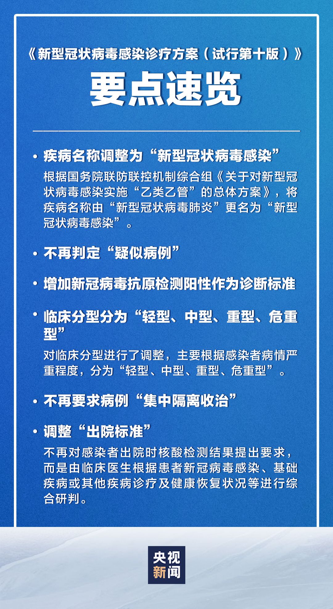 近日,国家卫生健康委会同国家中医药管理局组织对《新型冠状病毒肺炎诊疗方案(试行第九版)》进行了修订,形成了《新型冠状病毒感染诊疗方案(试行第十版)》。重点修订内容如下: